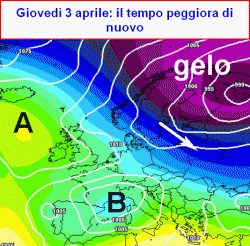 via l’aria fredda, tornano le correnti atlantiche ma con le nuove depressioni in difficile ingresso nell’area mediterranea per la contemporanea rimonta dell’alta pressione che porterebbe qualche giorno di bel tempo dal 7 al 10 aprile.