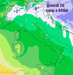 Aggiungiamo solo che le termiche padane sarebbero anche sufficienti ad accogliere i fiocchi ed infatti non escludiamo che, soprattutto la Valpadana centro-orientale, possa assistere a qualche leggera nevicata mista a pioggia, con le temperature così distribuite lungo il profilo verticale: -2°C a 1500m, 0°C ad 800m, 1°C a livello del suolo.
