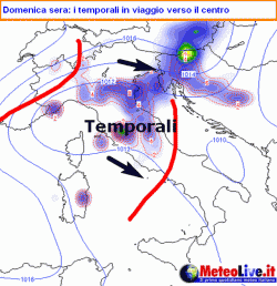 DOMENICA 26: instabile su Triveneto ed Emilia Romagna con possibilità di qualche temporale, in trasferimento verso Marche, Abruzzo e Molise. Altrove abbastanza soleggiato ma con sviluppo di focolai temporaleschi sull’Appennino centrale. Un po’ di nubi anche lungo le coste tirreniche della Calabria ma senza fenomeni. Calano le temperature anche al centro e sulla Sardegna per venti di Maestrale. I mari si agitano.