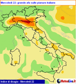 MERCOLEDI 22: bel tempo ovunque e clima molto caldo, con afa fastidiosa sulle zone di pianura, specie la val Padana e i settori interni del versante centrale tirrenico. Tra pomeriggio e sera sviluppo di focolai temporaleschi lungo le Alpi, con qualche sconfinamento in tarda serata possibile anche sull’alta pianura piemontese e lombarda.