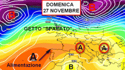 La cartina di previsione incentrata per le ore pomeridiane di domenica 27 novembre non lascia dubbi: getto sparato e depressioni a iosa sul nord Europa. Piccola depressione "satellite" sul nord Africa e tanta alta pressione intorno, con la chiara matrice subtropicale ben visibile sulla sinistra della foto.