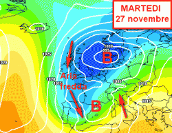 Questa cartina si riferisce alle prime ore della giornata di martedì 27 novembre. Un’entrata frontale del genere ( con tanto di aria fredda al sèguito) era un bel po’ che non si vedeva sul Mare Nostrum.