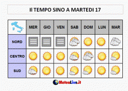 sabato 14: arrivo di aria umida dal golfo Ligure con addensamenti irregolari al nord, specie tra Liguria e bassa Lombardia, parziale dissoluzione delle nebbie e temperature in ripresa. Un po’ di nubi anche in Toscana, per il resto soleggiato.