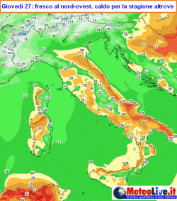 GIOVEDI 27: instabile al nord-ovest e lungo le Prealpi, con possibilità di rovesci sparsi e qualche temporale, localmente forte al nord-ovest. Nubi sparse ma tempo asciutto altrove. Caldo al sud e sulla Sardegna per Scirocco.