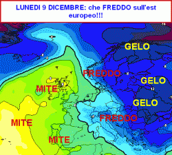 Per avere un’idea della mole di freddo e gelo che si ammasserà più ad est basta guardare questa cartina, valida per lunedì 9 dicembre.