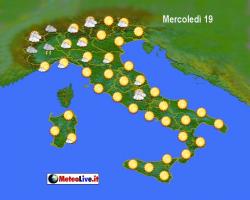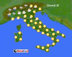 giovedì 20 giugno: al nord-ovest nuvolosità irregolare con locali rovesci già dal mattino su Alpi piemontesi e valdostane, poi innesco di temporali forti su Piemonte, alta Lombardia e Valle d’Aosta. Sul resto del nord passaggi nuvolosi ma tempo asciutto, peggiora verso sera sulle Alpi con alcuni locali rovesci o isolati temporali, specie sul Trentino. Sotto i temporali calo delle temperature. Altrove bel tempo e sempre molto caldo con punte di 37°C.
