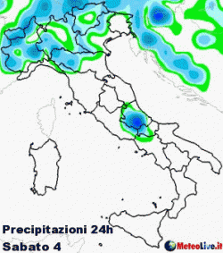 sabato 4 agosto: al nord nuvolosità irregolare e, grazie al parziale inserimento della saccatura atlantica, forse qualche temporale più esteso anche in pianura con colpi di vento e occasionali grandinate, con qualche grado in meno. Fenomeni comunque più probabili sulle Alpi. Al centro-sud sole e caldo, nel pomeriggio qualche temporale su Abruzzo, Molise, forse Campania e Pontino.
