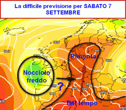 Dalla cartina di previsione, valida per le ore centrali della giornata di sabato 7 settembre, si nota il settore di nord-ovest e la Sardegna tremendamente al limite tra l’influenza del bello stabile più ad est e del perturbato/instabile presente più ad ovest.