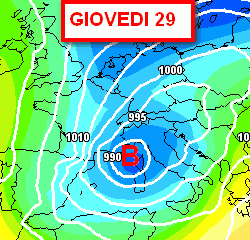 Giovedì 29 novembre: ancora tempo perturbato al mattino al nord e lungo i versanti tirrenici, con quota neve in calo sulle Alpi fino a 800-1000 metri, anche localmente più in basso nei rovesci. Parziale attenuazione dei fenomeni nell’arco della giornata. Tempo più asciutto in Adriatico. Temperature in calo al nord.