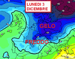 Le isoterme previste per lunedì 3 dicembre sono abbastanza indicative. Si tratta di una possibile linea di tendenza (in quanto la distanza previsionale risulta ancora elevata), tuttavia pare abbastanza evidente il raffreddamento che avverrà su gran parte dell’Europa nord-orientale e anche sul nostro Paese.