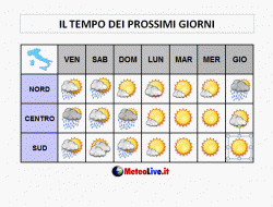 Più sole al nord e sulle isole, specie domenica. Da lunedì qualche disturbo nelle Alpi, per il resto soleggiato e più caldo. Possibile un nuovo guasto temporalesco al settentrione da giovedì prossimo.