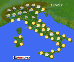 lunedì 2 luglio: aumenterà il rischio di temporali al nord, soprattutto sulle Alpi ma qualcuno possibile anche sulle zone pedemontane, occasionalmente violenti, in un contesto comunque ancora spesso soleggiato o parzialmente soleggiato e afoso, sole e caldo al centro-sud con punte ancora di 37-38°C.