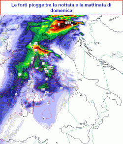lunedì 12 novembre: ancora maltempo sulle centrali tirreniche e sulla Venezia Giulia, con rovesci e temporali, coinvolte anche Umbria e Marche ma più moderatamente, asciutto altrove, ma con nuovo lieve peggioramento verso sera al nord-ovest, specie su Liguria e basso Piemonte con qualche pioggia. Temperature in lieve calo al centro-sud, in aumento al nord.