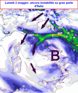 Anche sul nord-ovest, limitatamente alla giornata di lunedi 2 maggio, saranno possibili locali fenomeni di instabilità pomeridiana con rovesci o spunti temporaleschi, in particolare tra est e sud Lombardia, sereno sulle Alpi occidentali per venti secchi da nord.