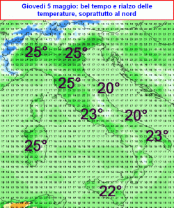 Giovedì 5 e venerdì 6 maggio bel tempo ovunque con rialzo generale delle temperature e punte di 25-26°C nei valori massimi, soprattutto in Valpadana e nelle zone interne delle regioni centrali tirreniche.