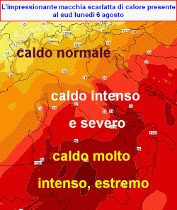 lunedì 6 agosto: nuovo impulso temporalesco in transito con fenomeni quasi tutti relegati alle Alpi e al Triveneto ma con parziale coinvolgimento anche della Lombardia, altrove bel tempo, caldissimo al sud, ma anche al centro, specie in Adriatico, sulle isole, severo su Sicilia, Calabria, Campania, Molise, Puglia, Lucania con punte di 42-43°C.