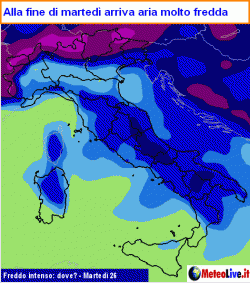 MARTEDI 26 nubi su cresta alpina centro-orientale, medio Adriatico e meridione, con tendenza a nevicate fin nei fondovalle nord-alpini, fino a 400-500 metri lungo la dorsale appenninica, 800 metri sui monti settentrionali siculi. Calano ulteriormente le temperature per venti forti e freddi dai quadranti settentrionali.