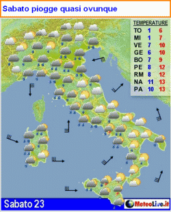 DOMENICA 24 ultime deboli piogge sulla bassa Padana, poi passaggio a tempo asciutto su gran parte del nord, ad eccezione della cresta alpina, dove potrà nevicare ancora, in maniera intermittente, fin verso i 1000-1200 metri. Più instabile al centro, al sud e sulle Isole, pur se con piogge intervallate da lunghe pause asciutte. Temperature leggermente al di sotto delle medie del periodo.