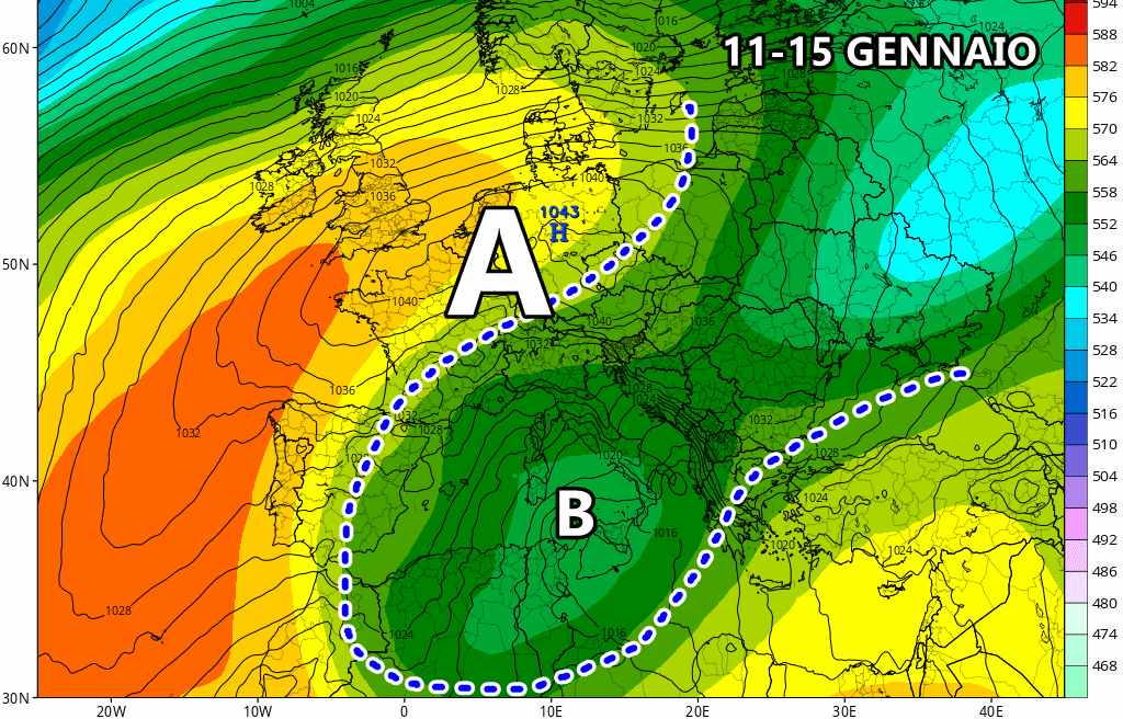 Venerdì 17 Gennaio: ciclone bloccato tra canale di Sardegna e Tunisia, rischio maltempo su Sardegna e Sicilia con locali nubifragi. Stabile altrove.
