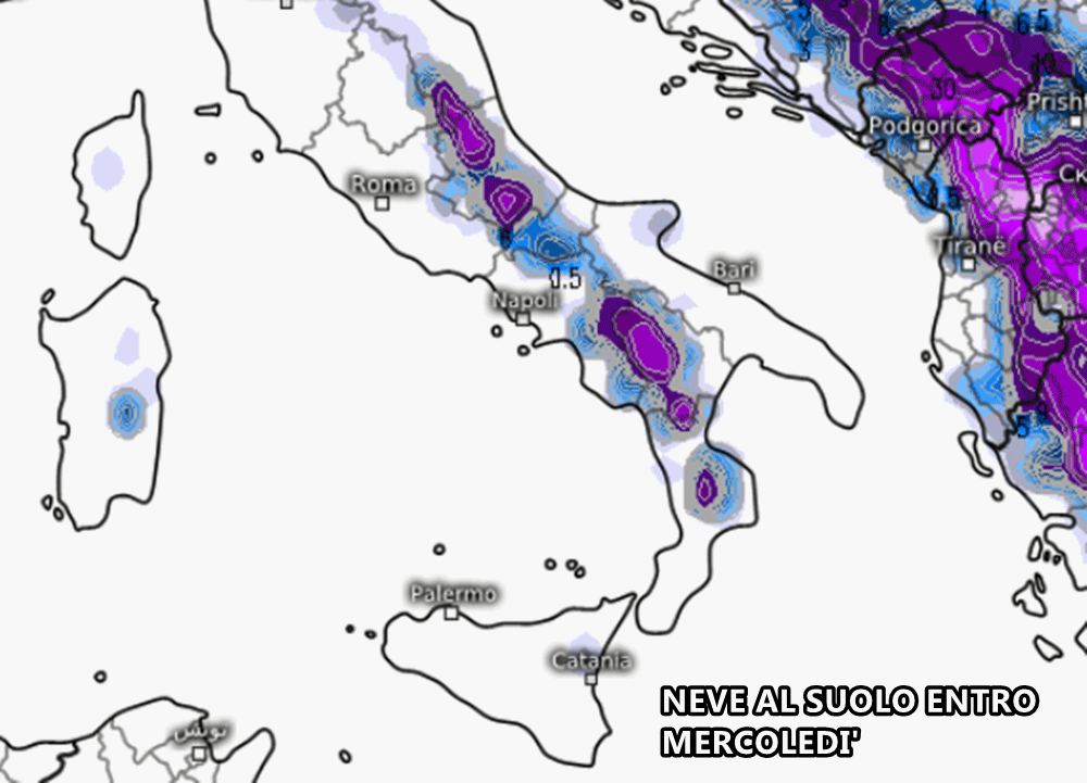 Al di sopra dei 600-700 m di altitudine, soprattutto tra Puglia, Campania, Molise, Basilicata e l’alta Calabria, sono previste abbondanti nevicate, con accumuli che potrebbero superare il metro entro martedì. Questo episodio rappresenta un evento invernale significativo come non lo si vedeva da diversi anni sul Meridione.