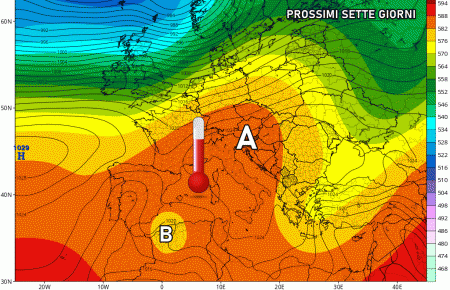 Le maggiori anomalie di temperatura sono previste proprio al nordovest, con picchi di 3-4°C oltre le medie. Valori in media o addirittura leggermente sotto le medie al sud.