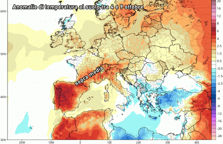 Martedì 4 ottobre: anticiclone sul Mediterraneo occidentale e perturbazioni atlantiche del tutto bloccate. Aria più fresca ma secca in Italia proveniente dai Balcani. Temperature in aumento lieve nelle massime.