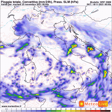 Martedì 23 novembre: nubi su gran parte d’Italia e fenomeni al centro e al sud, più concentrati sul lato adriatico. Possibili fenomeni anche sul versante ionico. Temperature in calo al nord, stazionarie altrove.