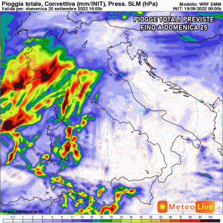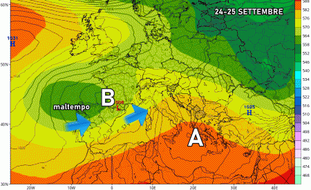 Domenica 25 settembre: possibile forte peggioramento al nordovest e Toscana con rischio piogge e temporali intensi. Più stabile e molto mite al sud.