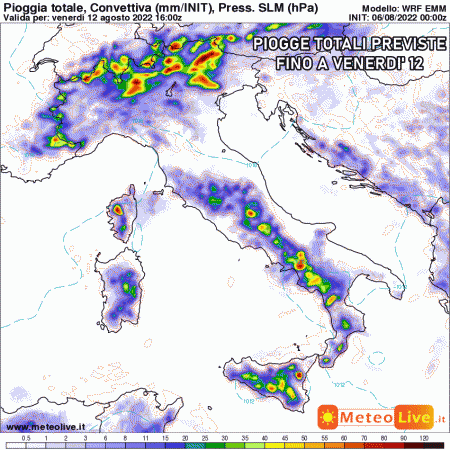 Sabato 13 agosto: ben poche variazioni, tempo ancora instabile specie tra pomeriggio e sera nei settori interni del centro e del sud nonché in pianura Padana e sull’arco alpino. Rischio temporali intensi in montagna e collina. Temperature stazionarie.