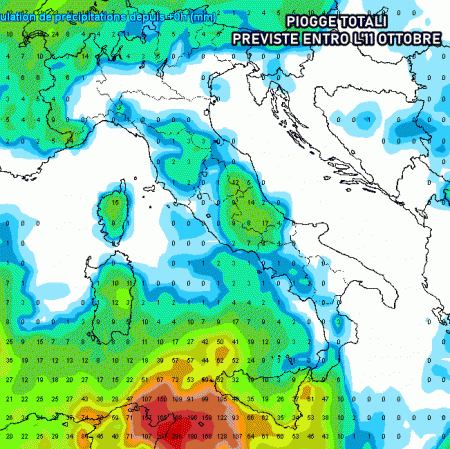 Martedì 11 ottobre: precipitazioni sparse sul lato tirrenico e le isole maggiori. Più asciutto altrove. Temperature in lieve calo.