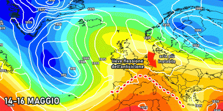 Nel corso del fine settimana, invece, l’anticiclone subirà una lieve flessione alle alte quote che andrà inevitabilmente a favorire un netto incremento dell’instabilità.