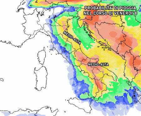 Ma il peggioramento più consistente arriverà venerdì quando scorrerà un fronte freddo ricco di piogge, temporali e venti forti che faranno scendere nettamente su gran parte della penisola. I fenomeni coinvolgeranno principalmente le regioni adriatiche ed il sud, dove avremo appunto il calo termico più importante, anche di oltre 10°C rispetto ai valori attuali. Le precipitazioni saranno nettamente più scarse, se non nulle, su regioni come Liguria, Piemonte, Valle d’Aosta, Lombardia, Sardegna.