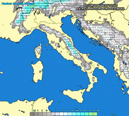 La parte più intensa della perturbazione coinvolgerà centro e sud Italia nel corso del fine settimana, apportando non solo piogge diffuse ma anche nevicate importanti lungo l’Appennino, a tratti fino a quote relativamente basse. Eloquenti gli accumuli di neve attesi nel prossimo fine settimana: