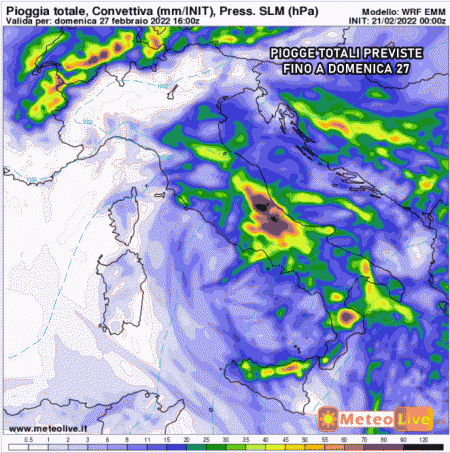 Martedì 22 febbraio: piogge diffuse e acquazzoni al sud e sul basso Adriatico, neve oltre i 600-700 metri. Sereno al nord, via via più soleggiato anche al centro. Venti di burrasca forte o tempesta sulle regioni centro-meridionali e sulle isole maggiori. Temperature in forte calo al centro e al sud.