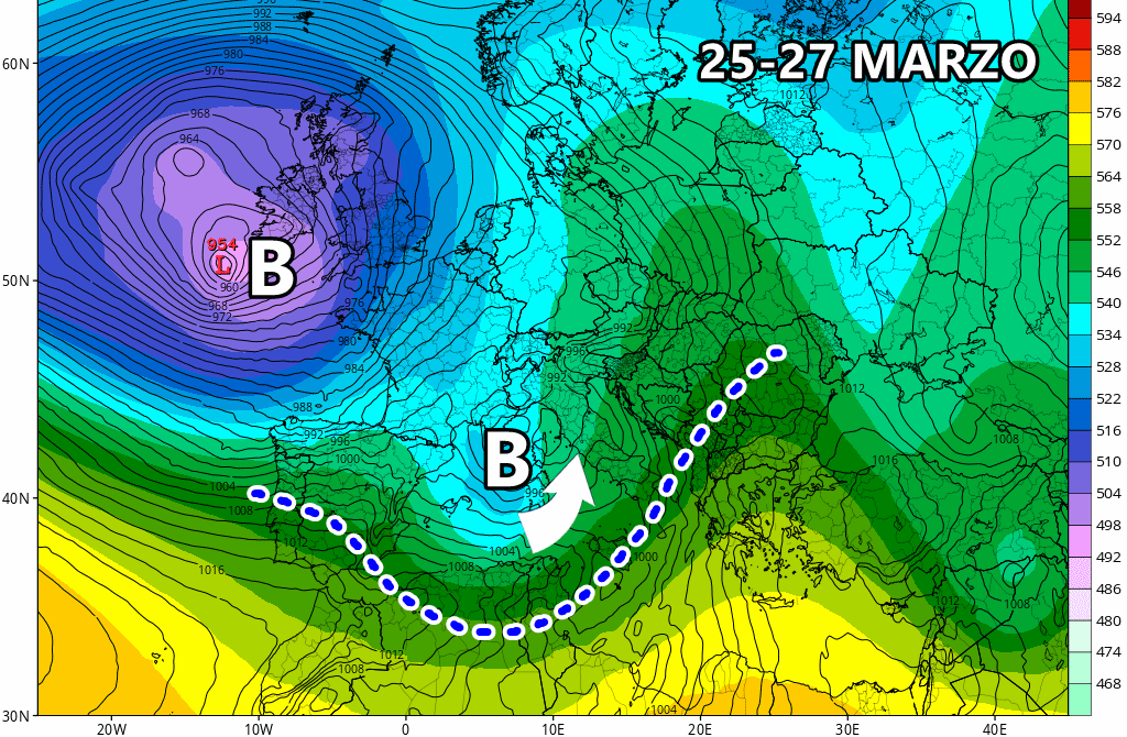 Lunedì 25 marzo: possibile sensibile guasto ad opera di una depressione atlantica colma di maltempo (da confermare).