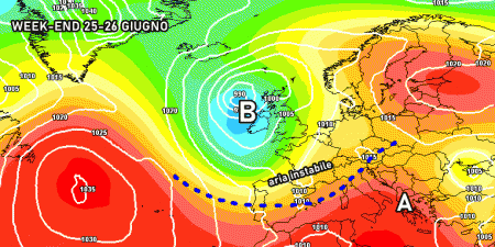 Sabato 25 giugno: Instabilità al nord con fenomeni localmente violenti. Nubi sparse al centro, ma clima molto caldo. Temperature eccezionali al sud.