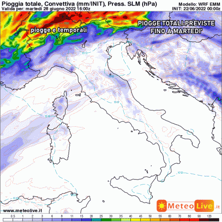 Venerdì 24 giugno: situazione analoga al giorno precedente. Temporali sparsi al nordovest e sulle Alpi, grande caldo altrove.