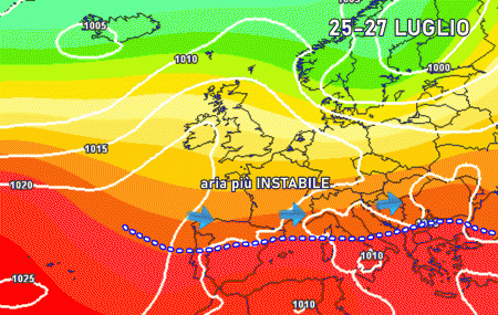 Mercoledì 27 luglio: possibile instabilità al nord e zone interne del centro, tempo generalmente stabile altrove. Temperature stazionarie o lievissimo calo.