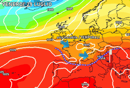 Venerdì 29 luglio: possibile nuovo peggioramento al nord con temporali diffusi e localmente molto forti. Stabile e caldo intenso al centro e al sud. Temperature in lieve calo al nord.