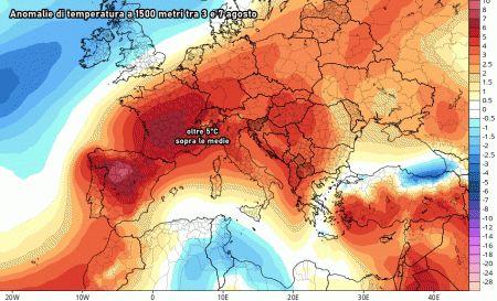 Nel corso della settimana il caldo sarà nuovamente intenso su tutto il nord ed il lato tirrenico, con picchi vicini ai 38-39°C nei settori interni lontani dal mare. L’anomalia di temperatura in alta quota tra 3 e 7 agosto potrebbe superare i 5°C al nord e l’alto Tirreno.