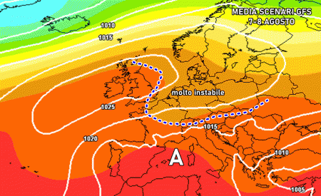 Una lieve flessione dell’anticiclone potrebbe sopraggiungere sul finire della settimana grazie a infiltrazioni instabili dall’Atlantico e dall’est Europa, come anticipato in questo articolo. In tal caso potremo fare i conti con temporali sempre in un contesto molto disorganizzato e ancora caldo.
