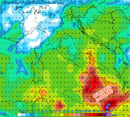 Accumuli eccezionali al sud nel corso dei prossimi 7 giorni (vedi mappe). Punte superiori ai 200 mm sull’arco ionico. Spuntano accumuli modesti anche al centro Italia grazie alla nuova depressione prevista la prossima settimana: