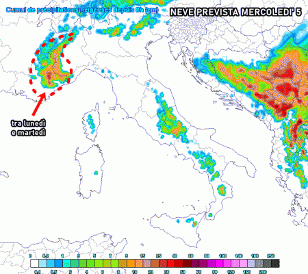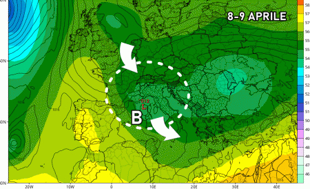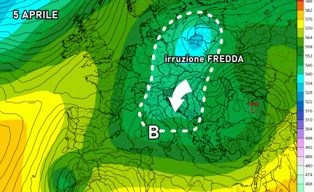 Mercoledì 5 aprile: ondata di freddo artico-continentale in Italia. Temperature in deciso calo specie al Nordest e sul lato adriatico. Piogge sparse e rovesci al sud, con neve fino a 1000 metri sull’Appennino meridionale, fino a 700 metri sull’Appennino centrale. Rari rovesci e temporali al nord e Appennino settentrionale, con fiocchi di neve fino a 500-700 metri (in caso di rovesci).