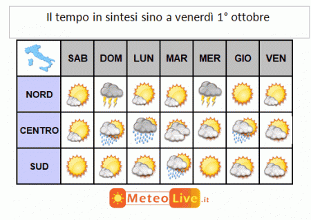IL TEMPO in sintesi sino a venerdì 1° ottobre: