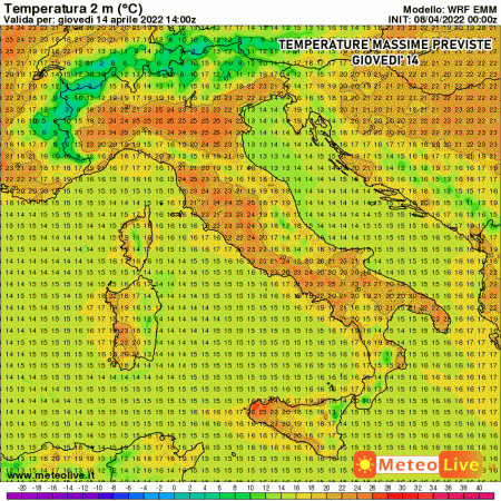 Venerdì 15 aprile: anticiclone in indebolimento, possibili acquazzoni e temporali sulle isole maggiori e al nord (necessariamente da confermare nei prossimi giorni). Temperature in aumento.