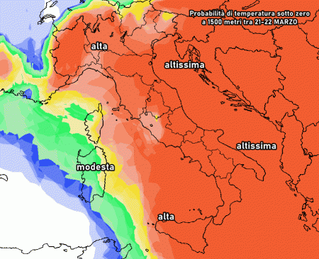 Lunedì 21 marzo: insistono fredde correnti nord-orientali con nevicate sparse a bassissima quota sul basso Adriatico e al sud. Più stabile altrove. Clima freddo e pienamente invernale.