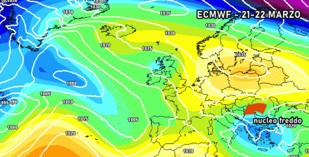 Martedì 22 marzo: ancora freddo su tutta Italia, nuovo nucleo instabile in arrivo dai Balcani con tanto freddo e nevicate sparse fino in collina su Abruzzo, Molise, Puglia, Calabria, Basilicata. Stabile e freddo al nord.