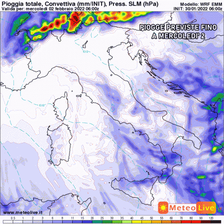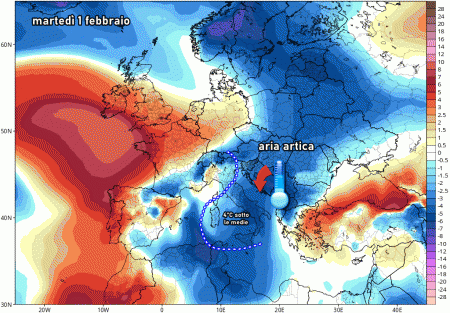 Martedì 1 febbraio: incursione di aria fredda che darà vita ad una depressione tirrenica. Maltempo diffuso al sud, residui fenomeni al centro. Neve fino in alta collina sull’Appennino centro-meridionale. Accumuli abbondanti oltre i 900/1000 metri. Temperature in netto calo.
