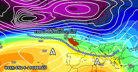 Sabato 5 febbraio: probabile ingresso di aria umida atlantica verso le regioni tirreniche e il nord, con piogge deboli e sparse. Temperature in aumento.
