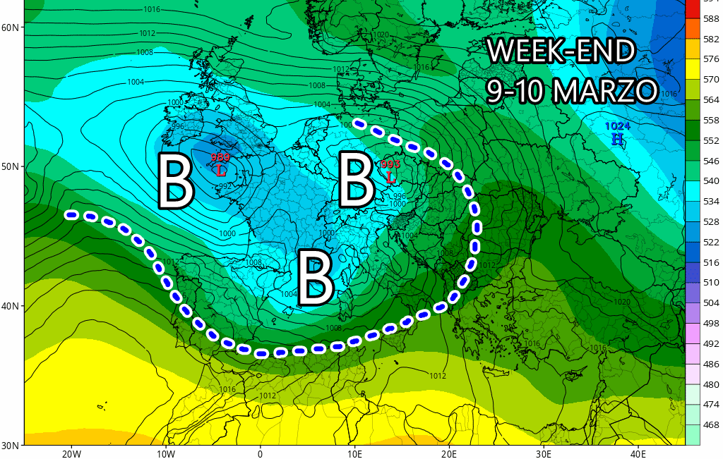 Ormai non ci sono più dubbi sull’arrivo di una nuova ondata di maltempo nel corso del fine settimana, determinata da masse fredde nord-atlantiche che svilupperanno addirittura un ciclone particolarmente intenso nel cuore del Mediterraneo. Le sue caratteristiche sembrano simili all’ondata di maltempo dello scorso weekend, la quale aveva già portato forti precipitazioni, anche abbondanti nevicate in montagna, soprattutto sul nord-ovest. Ora, questa nuova ondata di maltempo apporterà ulteriori precipitazioni, localmente molto abbondanti su buona parte della penisola, in maniera più diretta sulle regioni tirreniche e quelle del Nord Italia.